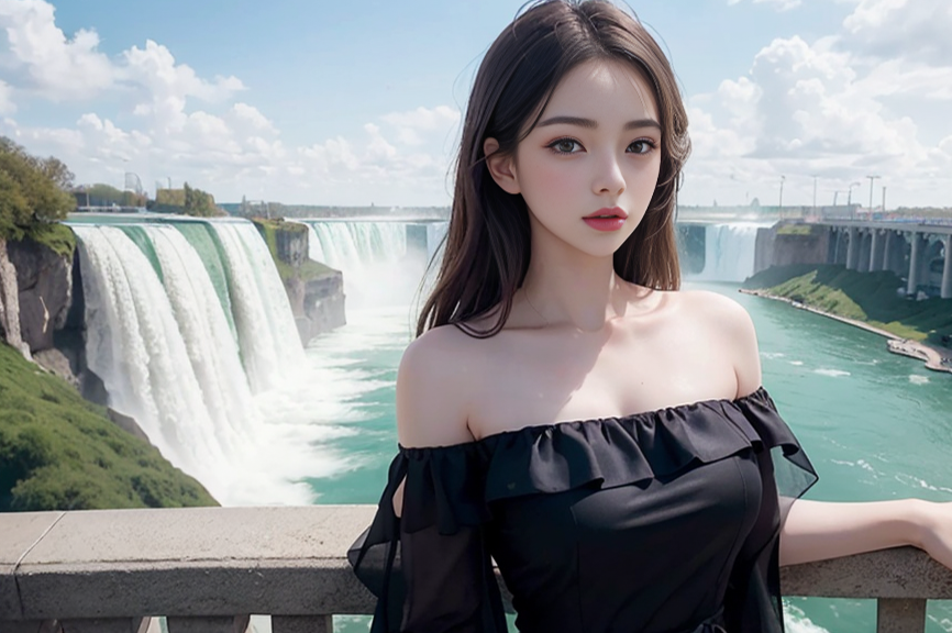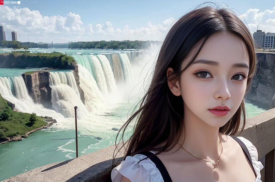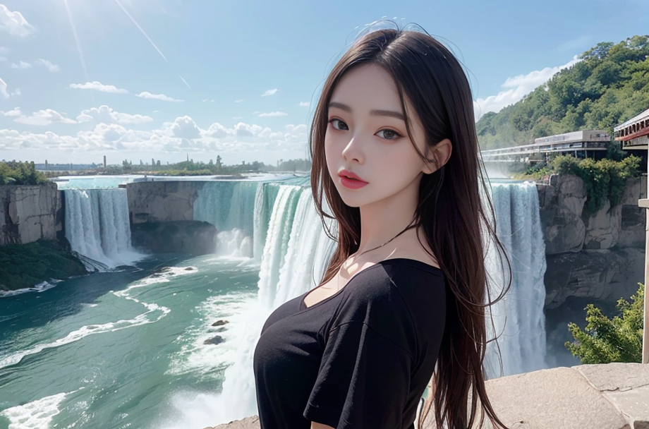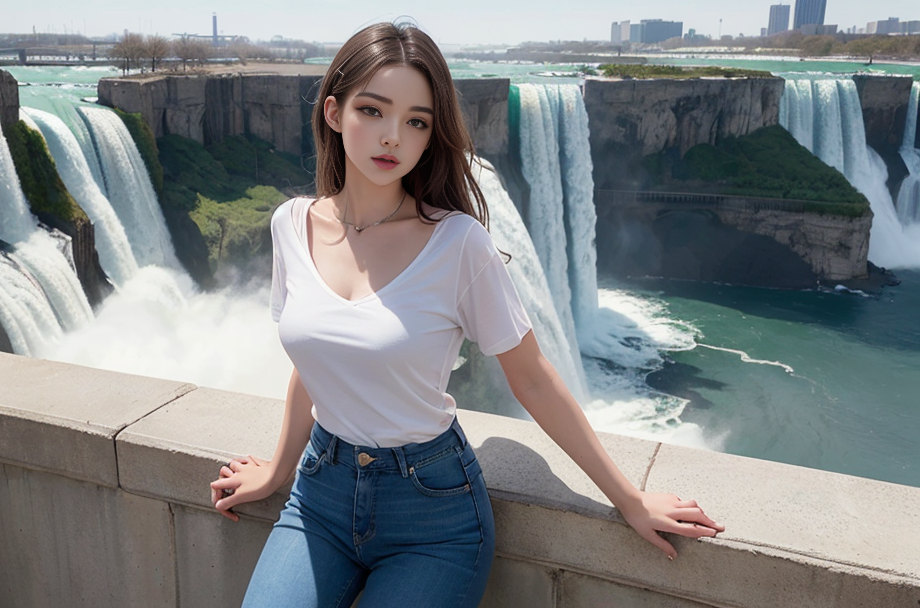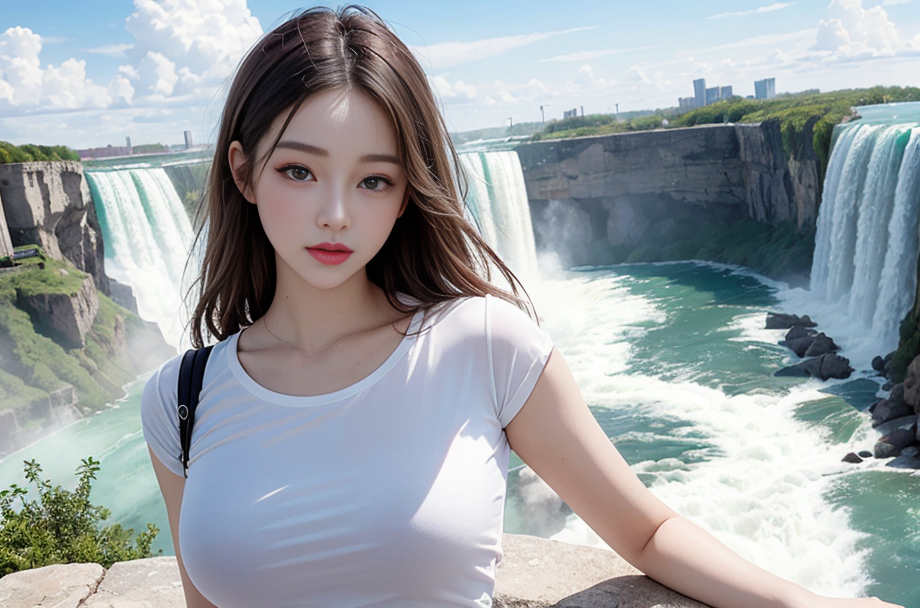 A breathtaking view of Niagara Falls with a beautiful woman standing at the edge, captivated by the majestic cascades.(t-shirt), (An extremely delicate and beautiful work), (masterpiece), (best quality),(beautiful), ((looking at viewer)), lovely lips, cinematic light, ultra-fine painting, delicate face, delicate figure, Fine collarbones, ultra detailed, highres, (realistic, photo-realistic:1.4), 8k, raw photo, physically-based rendering, professional color graded, 8K, F2.4, 35mm. <lora:koreanDollLikeness:0.3> ulzzang-6500-v1.1