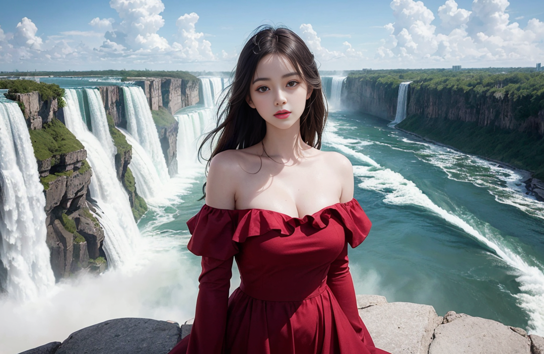 A dramatic aerial view of Niagara Falls, with a beautiful woman in a flowing gown suspended in mid-air, surrounded by swirling mist.(off shoulder dress), (An extremely delicate and beautiful work), (masterpiece), (best quality),(beautiful), ((looking at viewer)), lovely lips, cinematic light, ultra-fine painting, delicate face, delicate figure, Fine collarbones, ultra detailed, highres, (realistic, photo-realistic:1.4), 8k, raw photo, physically-based rendering, professional color graded, 8K, F2.4, 35mm. <lora:koreanDollLikeness:0.3> ulzzang-6500-v1.1